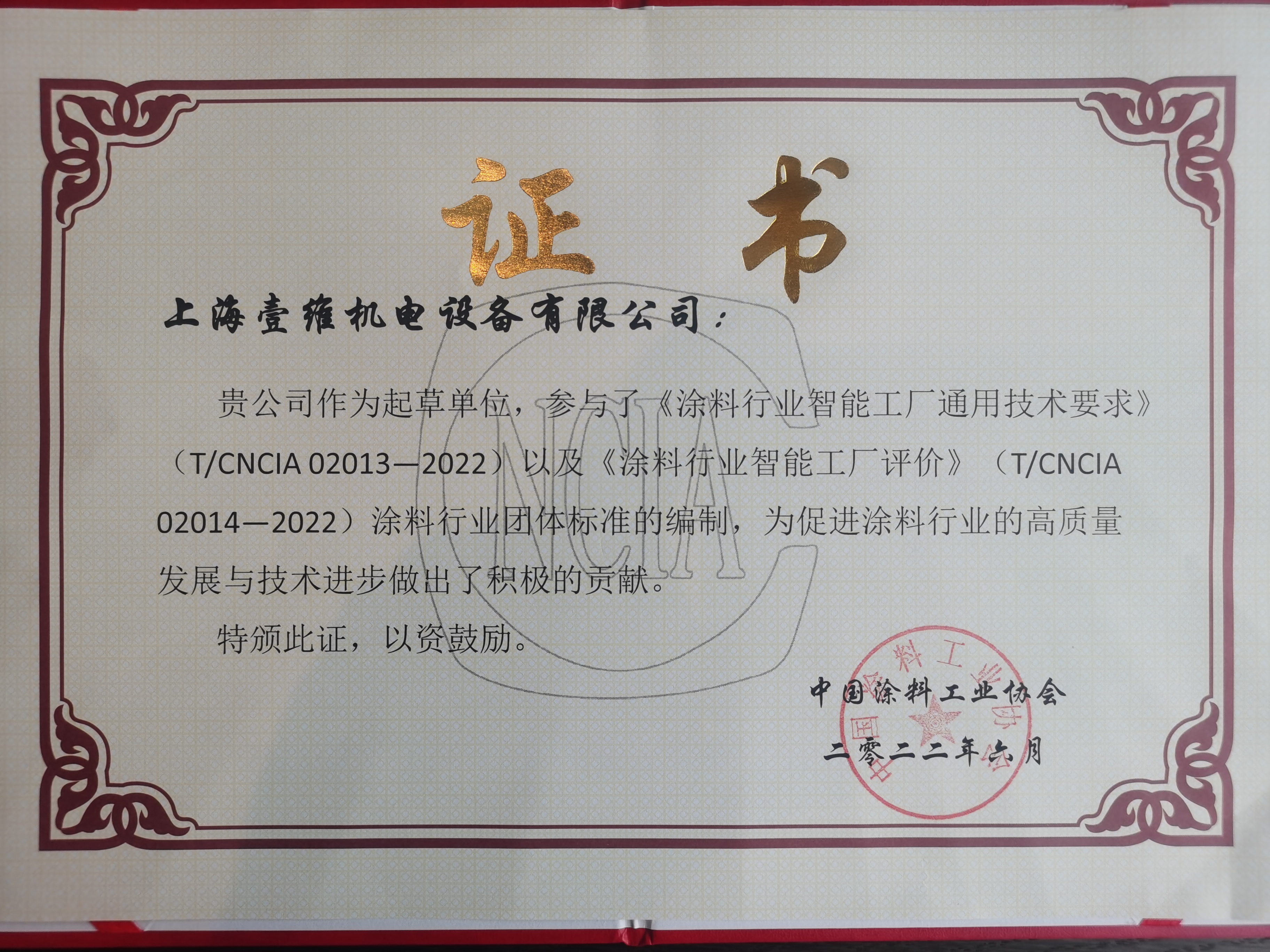 上海壹維作為國內(nèi)規(guī)模較大的涂料設(shè)備制造商之一,是較早引入智能制造,高效環(huán)保技術(shù)的涂料生產(chǎn)設(shè)備廠家。從涂料廠的規(guī)劃、勘察、設(shè)計、采購、施工到投產(chǎn),具有豐富的行業(yè)經(jīng)驗(yàn)。涂料生產(chǎn)過程實(shí)現(xiàn)數(shù)字化、智能化、網(wǎng)絡(luò)化的運(yùn)營,從根本上提高產(chǎn)品功能、性能和市場競爭力。同時在此次大會上,上海壹維參與《涂料行業(yè)智能工廠通用技術(shù)要求》以及《涂料行業(yè)智能工廠評價》涂料行業(yè)團(tuán)體標(biāo)準(zhǔn)的編制得到了涂料工業(yè)協(xié)會的認(rèn)可,并特頒發(fā)證書以資鼓勵。
